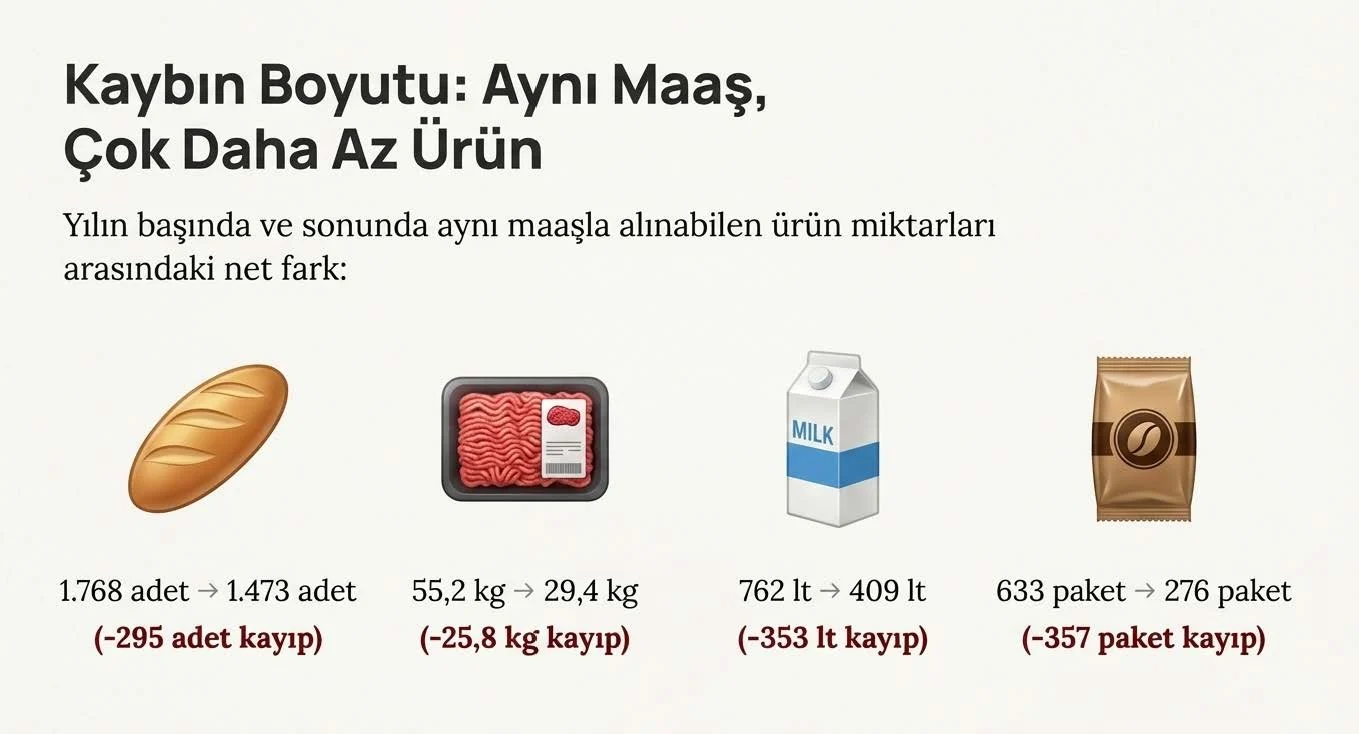 Gürer, ocak ayından aralık ayına kadar ekmeğin yüzde 20, salçanın yüzde 80, kahvenin yüzde 129, sütün yüzde 86, dana kuşbaşının yüzde 102, dana kıymanın yüzde 87, tereyağının yüzde 98, beyaz peynirin yüzde 58, pirincin yüzde 74, çayın yüzde 49 arttığını ifade eden Gürer, bir asgari ücretlinin ocak ayında aldığı ürünleri aralık ayında da alabilmek için fazladan çalışması gereken süreyi ürün bazında şöyle anlattı: