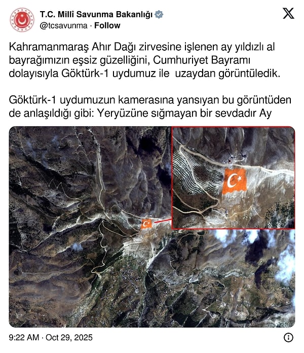 ‘Ahır Dağı zirvesine dikilen dev Türk Bayrağı, Cumhuriyet Bayramı nedeniyle Göktürk-1 uydusuyla uzaydan görüntülendi. Bu görüntüden de anlaşıldığı gibi, Türk Bayrağı yeryüzüne sığmayan büyük bir sevginin simgesidir.’