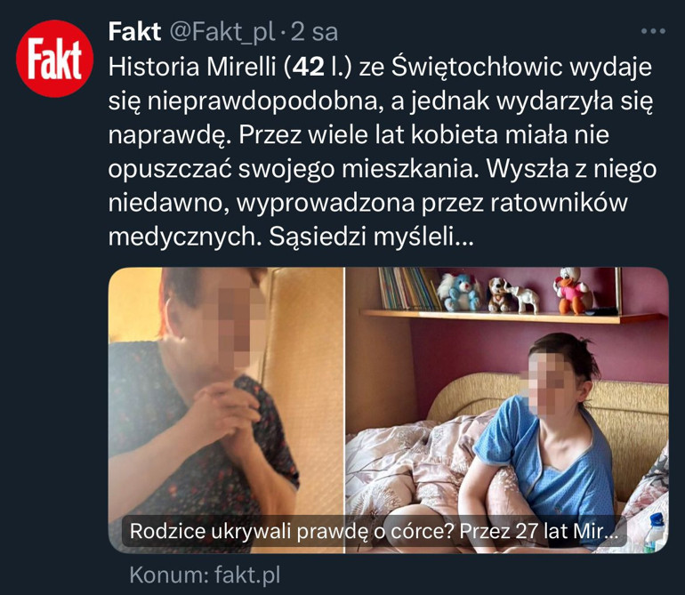 Adı sadece Mirrella olarak açıklanan kadın, en son 1998 yılında 15 yaşındayken, Polonya’nın güneyindeki Świętochłowice kentinde görülmüştü. Ailesi, komşularına genç kızın kaybolduğunu söylemişti ancak yaklaşık 30 yıl sonra Mirrella’nın aslında ailesi tarafından esir tutulduğu ortaya çıktı.