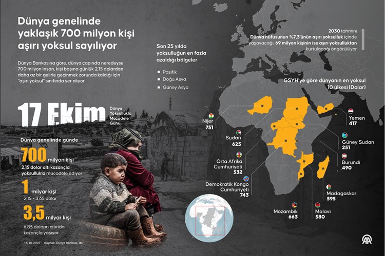 Dünya Bankasının 2024 için derlediği raporuna göre ise dünya nüfusunun yaklaşık yüzde 8,5’i aşırı yoksulluk sınırında yer alırken bu oran, dünya çapında neredeyse 700 milyon insanın kişi başına günlük 2,15 dolardan daha az bir gelirle geçinmesi anlamına geliyor.